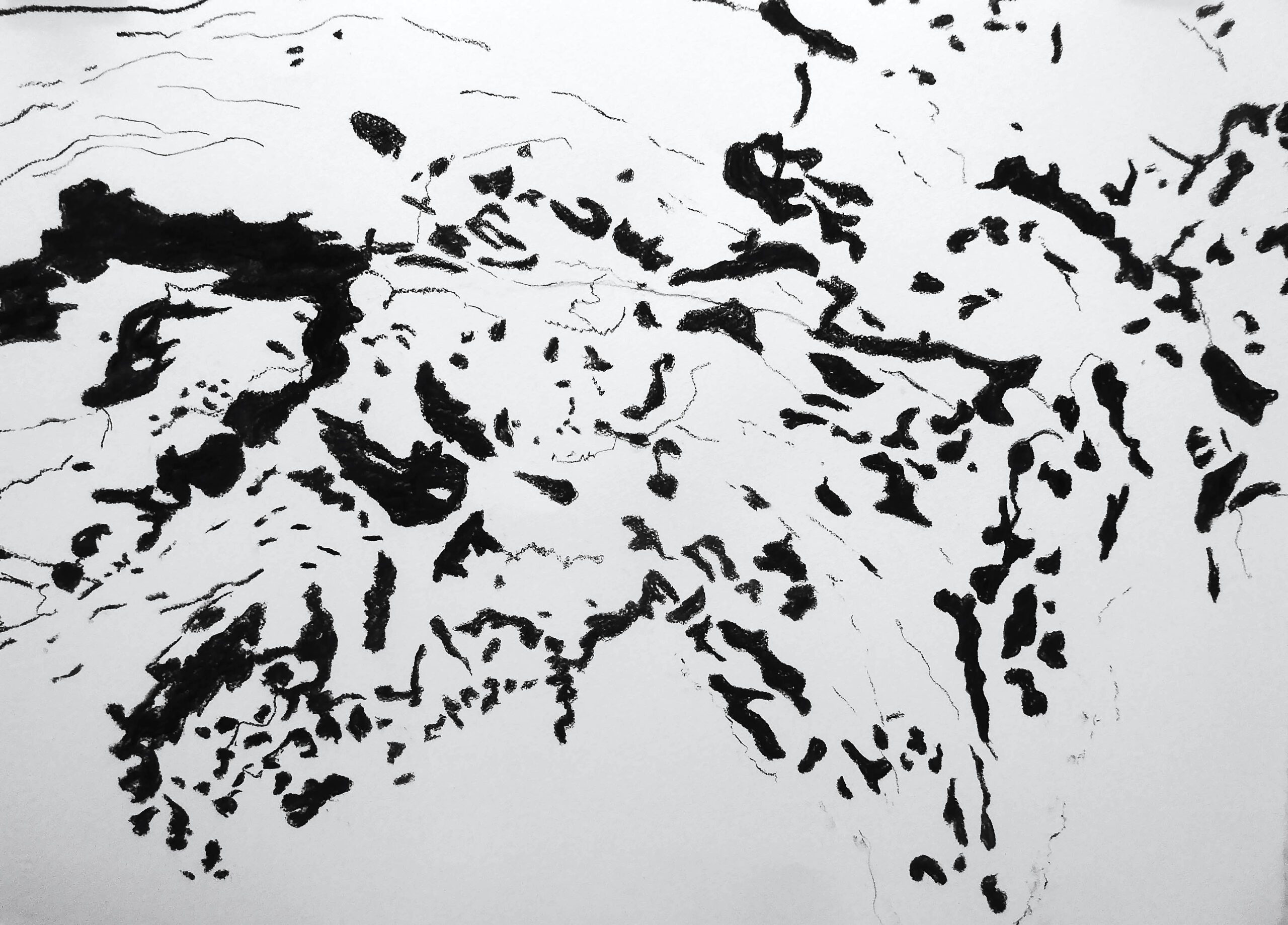 Jutta Brunsteiner, die letzte der fünf Ausstellenden in Wien, hat dort viele Zeichnungen geschaffen, von denen nur ein kleiner Bruchteil ausgestellt werden kann. Dazu kommen Fotografien, die überlagert und digital verändert werden und zu genauer Betrachtung einladen. Beides ist sehr stark inspiriert von den Wiener Parks und den Donau-Auen.