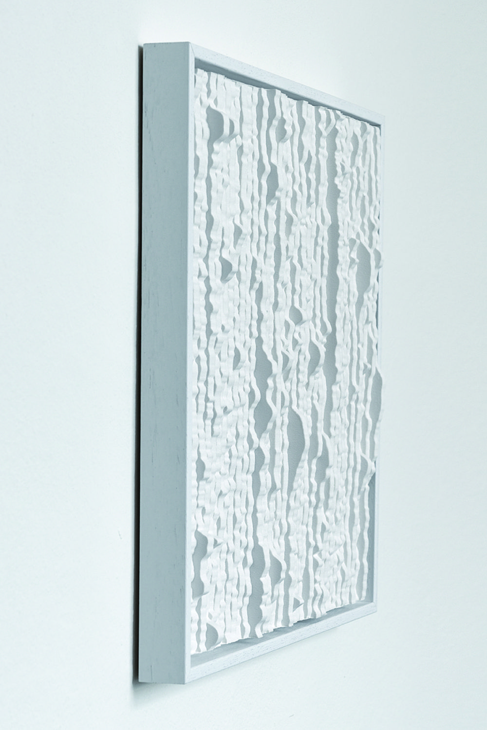 Im dritten Ausstellungsraum sind Reinhard Gupfingers gegossene Reliefs, wie Zeilen aneinander montiert in Rahmen oder auch als frei stehende-Teile zu sehen. Der Künstler konserviert die aus Hartschaum (Polystyrol)-Streifen geschnittenen Unikate mit einer Gießmasse, der Keramikpulver beigemischt ist, als Unikate.