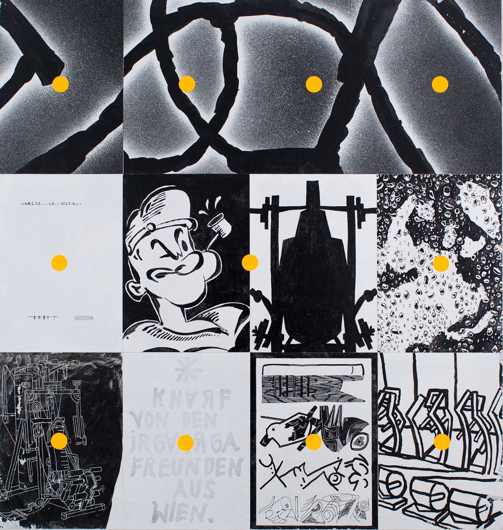 In Paris hat Frank Furtschegger, wie das seiner Arbeitsweise entspricht, große Zeichnungen und Collagen im öffentlichen Raum befestigt und manche davon zum Teil noch überarbeitet. Diese temporären Kunstwerke sind mit Fotografien dokumentiert und im Studio in einer 10-Minuten langen von Künstler kommentierten Fotoserie auf einem alten Röhrenfernseher zu sehen. Im Traklhaus zeigt er neue, 2016 in Österreich entstandene Arbeiten, Siebdrucke und die Folien dafür, Collagen aus Vorlagen und Unikatdrucke. Frank Furtschegger stammt aus Salzburg, studierte an der Akademie der bildenden Künste in Wien und lebt dort, bzw. auf Reisen.