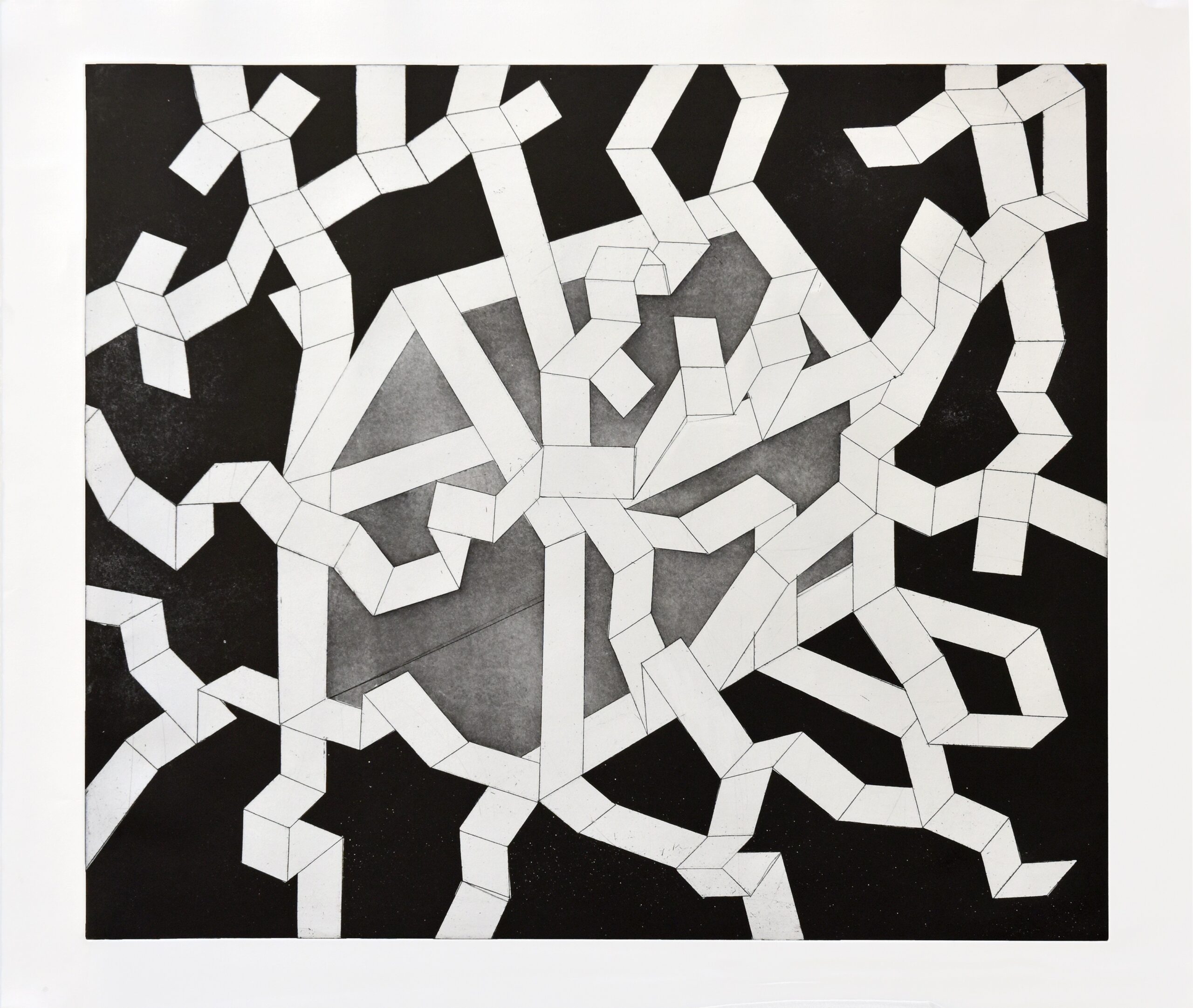 Brigitte Naprudnik hat, wie die anderen beiden Künstler*innen mit Eva Möseneder zusammengearbeitet, bei ihr gelernt. Die Künstlerin ist 1970 in Salzburg geboren, studierte an der Universität Mozarteum und arbeitet in Salzburg, derzeit in einem Förderatelier des Landes. In der grafischen Werkstatt im Traklhaus hat sie seit vergangenem Jahr verschiedene Serien geschaffen, in denen es auch um spezielle Präsentationen der einzelnen grafischen Blätter geht. Sie stellt unter anderem ein Objekt aus mit überarbeiteten Lithografien, die in geringem Abstand zueinander befestigt sind. Ihr geht es bei der Druckgrafik nicht um die Vervielfältigung, sondern um das Schaffen von Arbeiten, die irgendwie auch als Unikate dastehen.